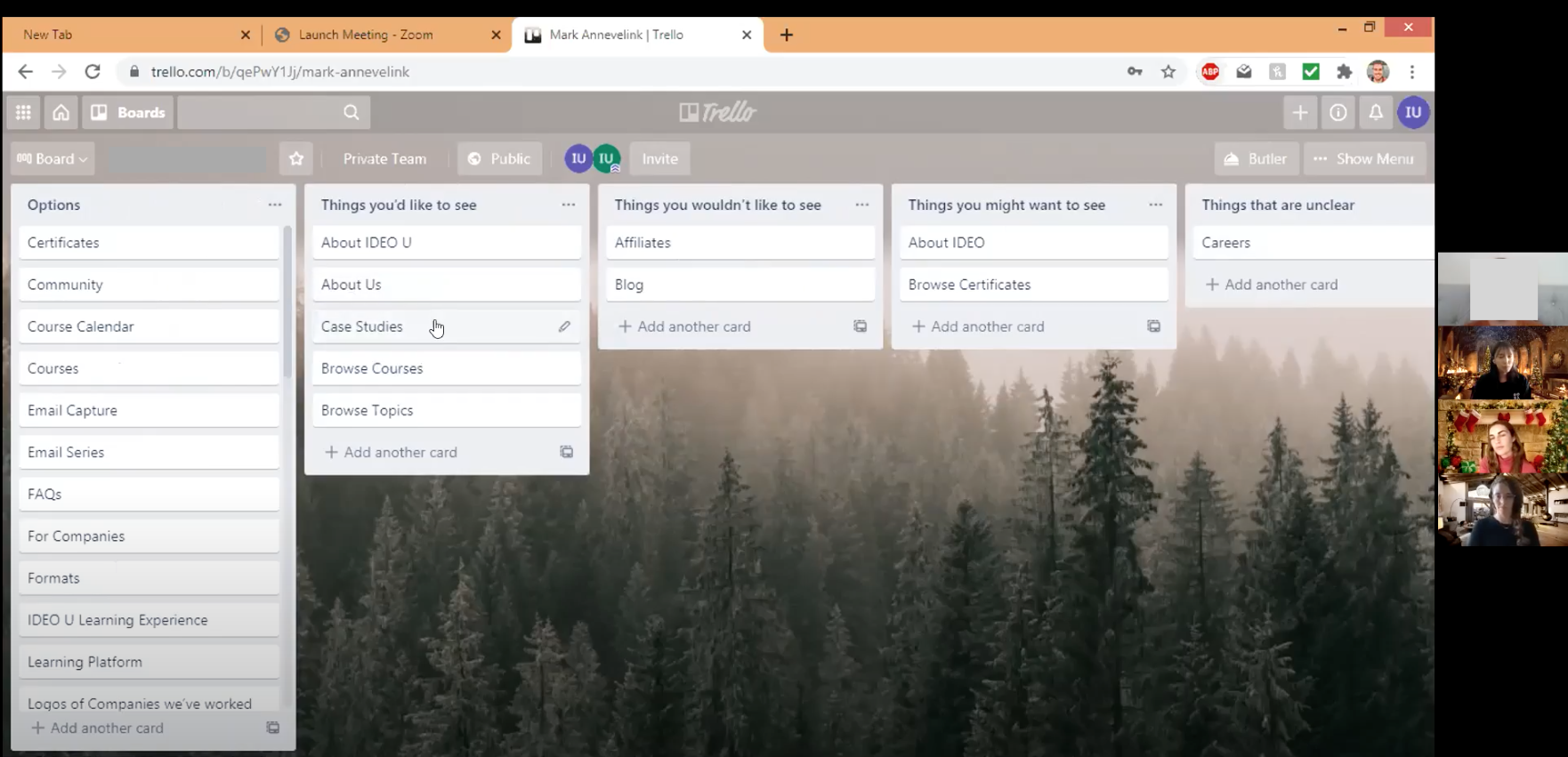 Working with our Chief of Staff, we screened and scheduled four new prospective learner interviews. We designed our sessions to include two main activities: 1) a closed card sort on Trello to determine hierarchy and preferences for certain homepage sections, and 2) usability testing on both the homepage and course quiz assessment tool.