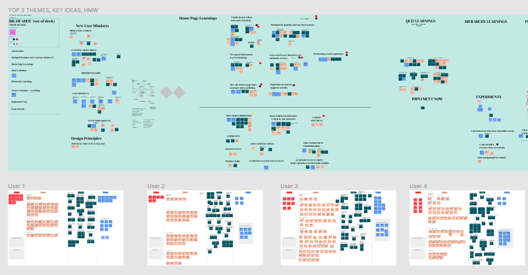 As we pieced together the data, the scope of our project shifted. Our original project brief was thinking of the potential option paralysis to happen in the convergent phase of choosing the specific course they wanted while already on the website. As we started diving into research though with an emphasis on new users who are unfamiliar with IDEO U, we started to see that many of the potential paralysis moments were actually happening in the first convergent moment of a double diamond model. In other words, new learners kept getting stuck early in the journey when trying to first orient themselves to who we even are.