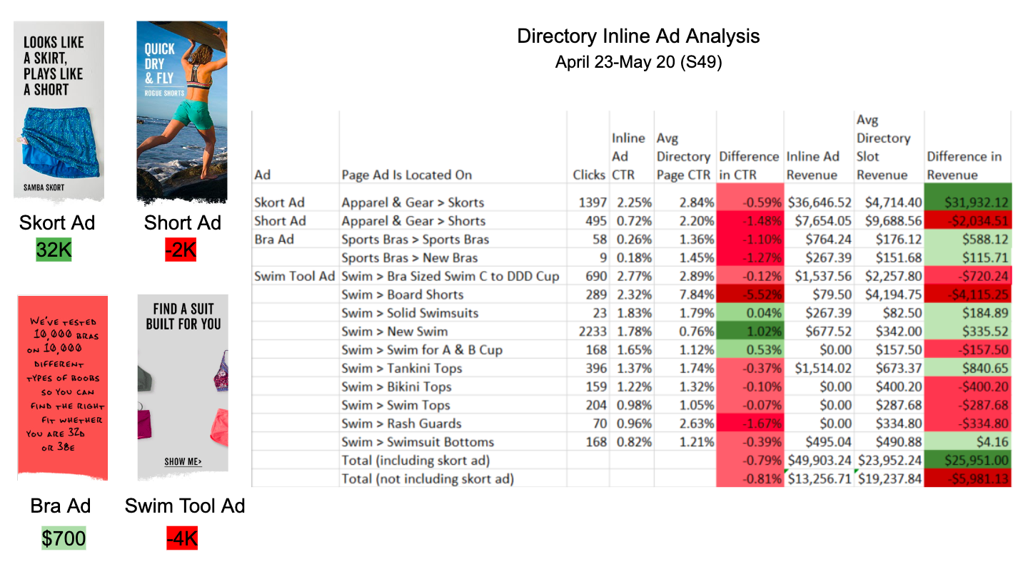 We implemented directory inline ads onto our site in the hopes that the ads would improve conversion rate (CTR) and provide brand lift. However, Google Analytics data limited us to get a full and clear read on revenue and conversion rate. I pulled data comparing ad CTR and revenue vs. if a product were there (Avg directory page CTR & Rev).